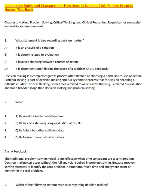 Discover the comprehensive Test Bank For Leadership Roles and Management Functions in Nursing 10th Edition by Marquis Huston. Enhance your learning with a wide range of practice questions and assessments tailored to your course needs. Download Free Sample